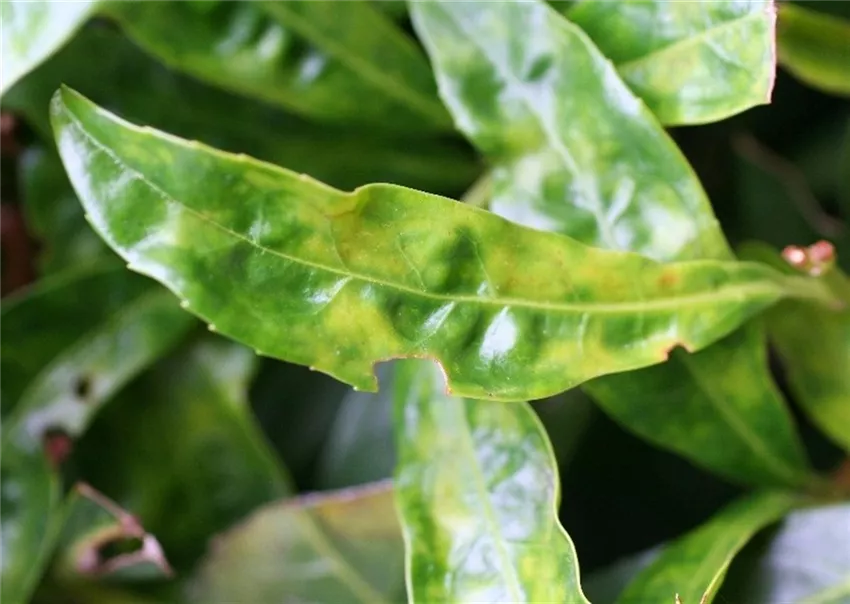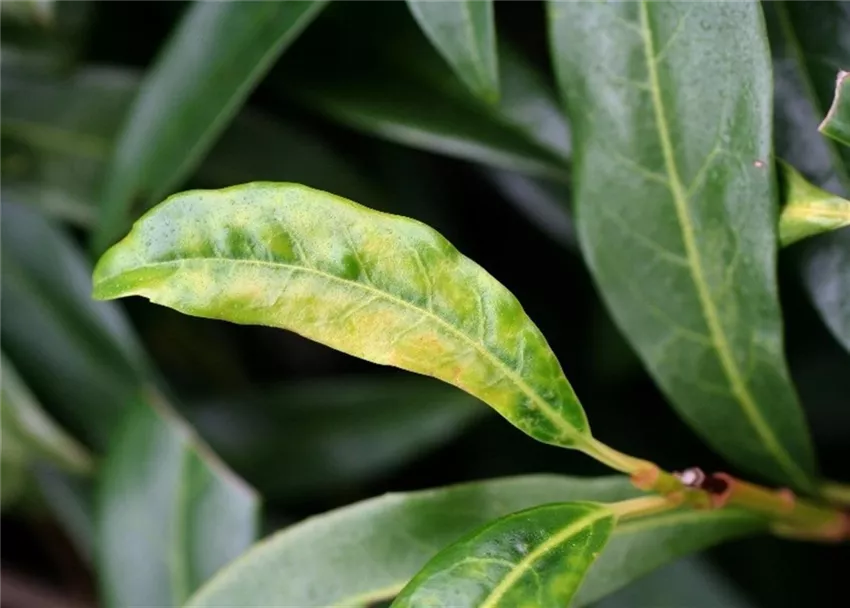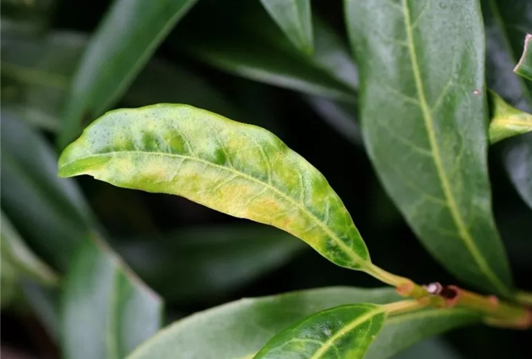 Im Hoch- oder Spätsommer sind junge Blätter und Triebe heller gefärbt, als normal. Insgesamt bleiben die Blätter auch kleiner, sie sind wellig verkrüppelt und das Triebwachstum ist gebremst.
