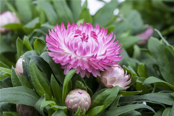 Die Strohblume (Bracteantha) ist eine beliebte Pflanze für den Balkon. Die unzähligen Blüten erscheinen, je nach Sorte, in verschiedenen Farben die ganze Saison hindurch. Ein sonniger Standort und ein durchlässiges Substrat werden bevorzugt.