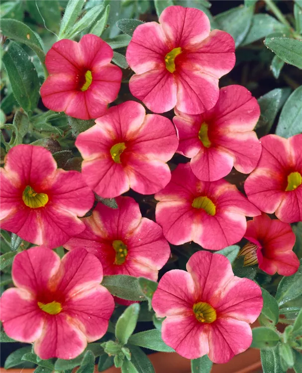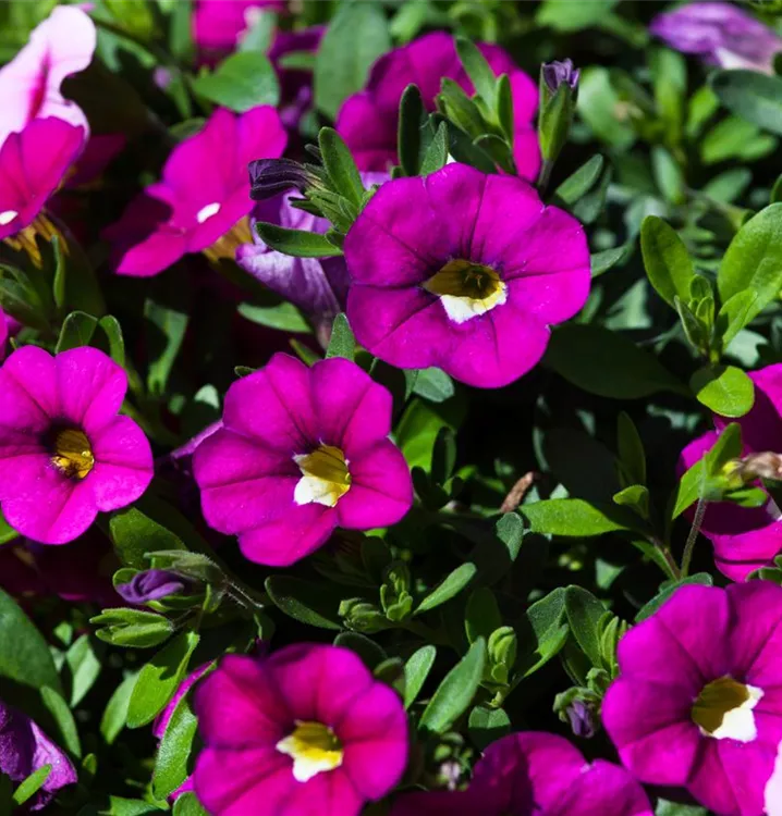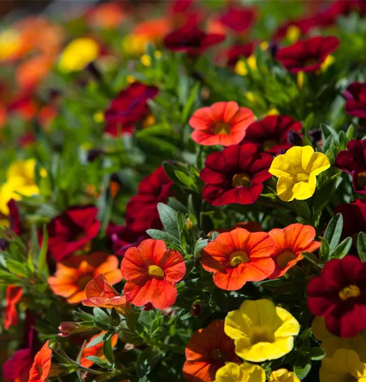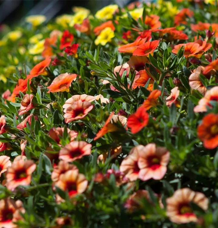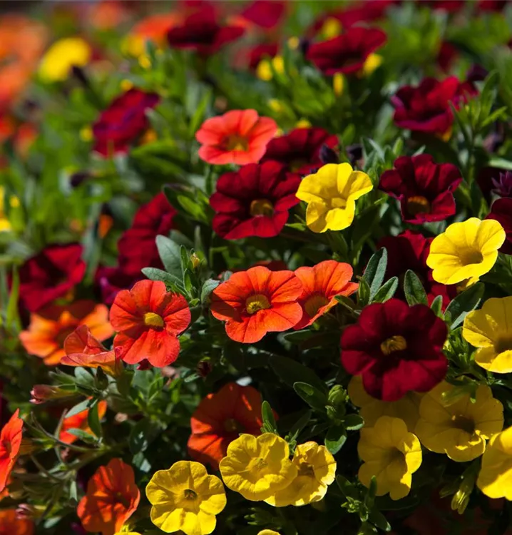 Calibrachoa bildet während der gesamten Saison zahlreiche trichterförmige, bunte Blüten.