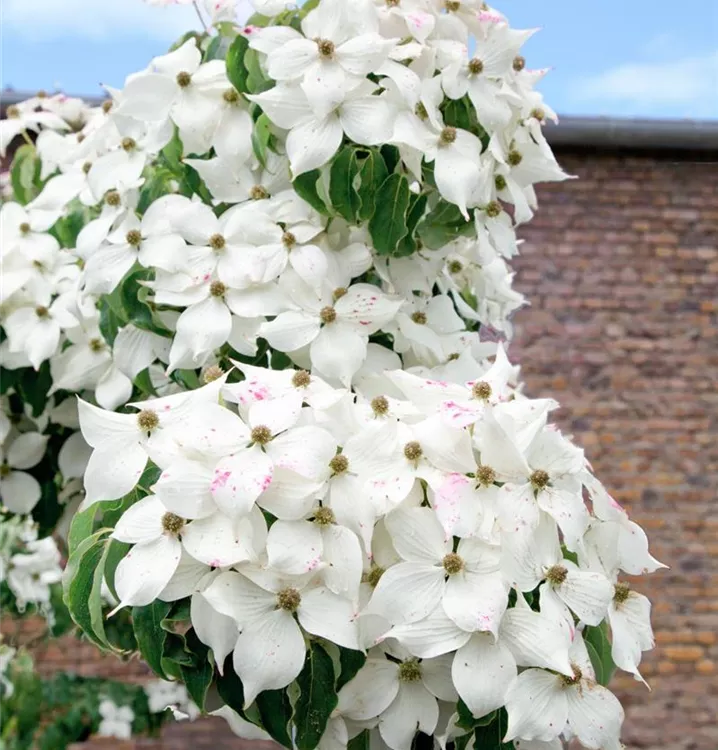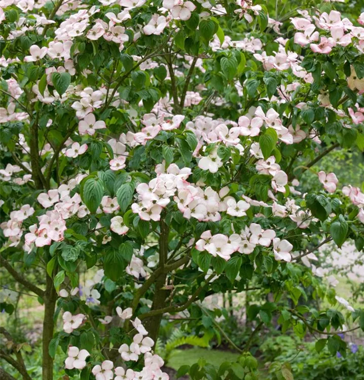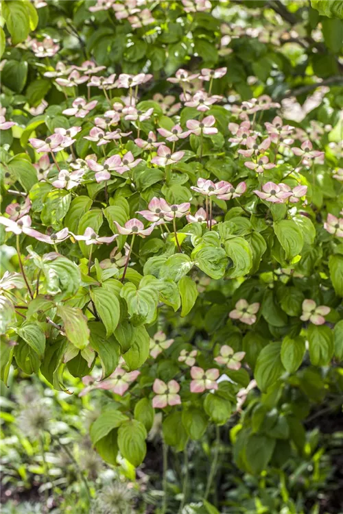 Japanischer Blumen-Hartriegel ist ein aufrecht und ausladend wachsender Großstrauch. Er erreicht gewöhnlich eine Höhe von 4 - 6 m und wird ca. 4 - 5 m breit.