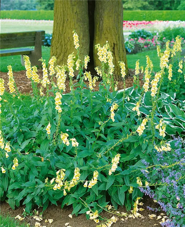 Digitalis grandiflora bildet glockenförmige, hellgelbe Blüten ab Juni.