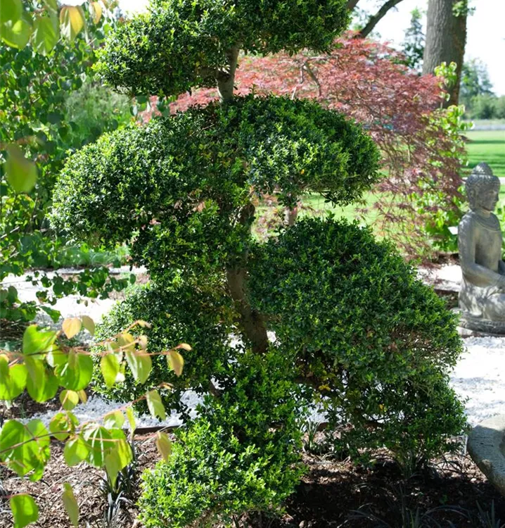 Japan-Stechpalme ist ein aufrecht wachsender Strauch. Sie erreicht gewöhnlich eine Höhe von 2 - 3,5 m und wird ca. 1 - 2 m breit. In der Regel wächst sie 10 - 15 cm pro Jahr.