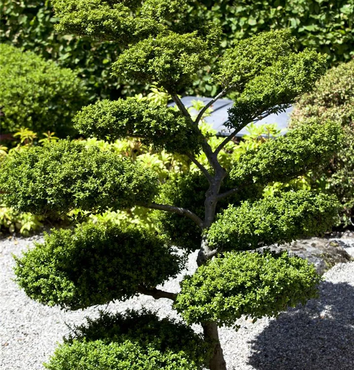Die Japan-Stechpalme (Ilex crenata) ist ein aufrechter Strauch mit dekorativen, schwarzen Früchten, die sehr lange haften. Die Blüten erscheinen je nach Sorte in verschiedenen Farben.