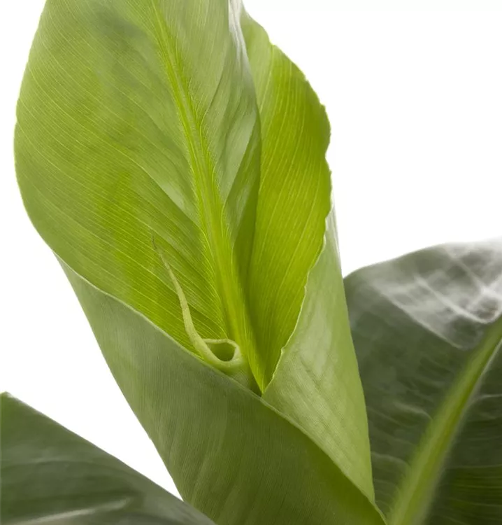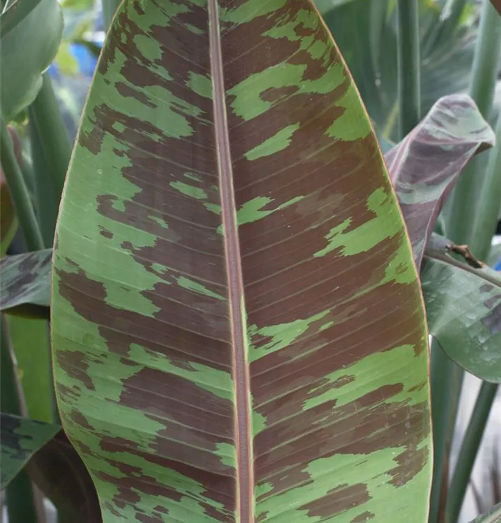 Die immergrünen Blätter der Essbanane sind mehrfarbig, eiförmig.