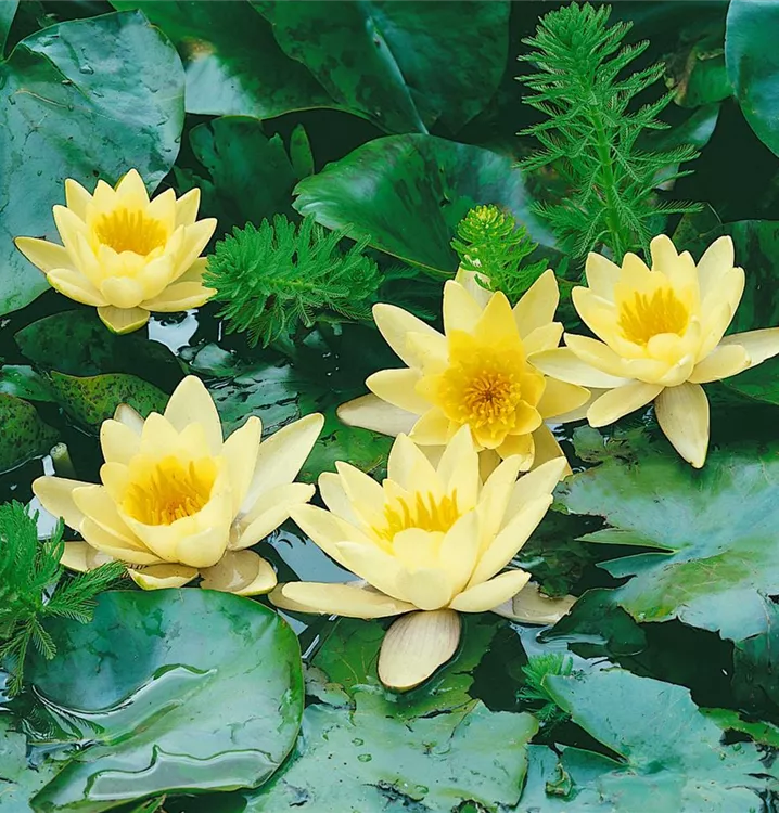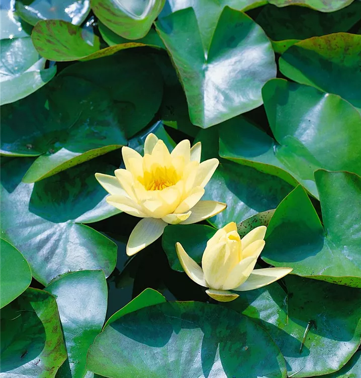 Die Garten-Seerose 'Marliacea Chromatella' (Nymphaea) ist mit ihren dunkelgrünen Blättern eine ausgesprochen dekorative Wasserpflanze, die für solche Einsatzbereiche wie Teich besonders gut geeignet ist. Die Blüten erscheinen, je nach Sorte, in vielen Farben von Juni bis September. Sie bevorzugt humosen, nährstoffreichen Boden in sonniger Lage. Die Garten-Seerose 'Marliacea Chromatella' ist gut frostverträglich. Die flache Staude erreicht gewöhnlich eine Höhe von ca. 15 cm.