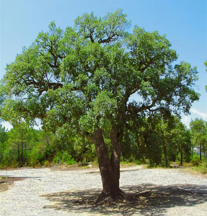 Kork-Eiche ist ein rundlich wachsender Kleinbaum, der eine Höhe von 2 - 3 m und eine Breite von 1,5 - 2 m erreichen kann. In der Regel wächst sie 20 - 35 cm pro Jahr.