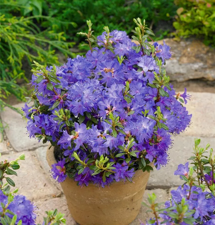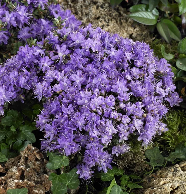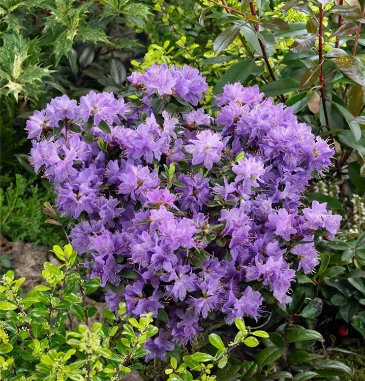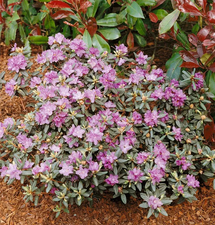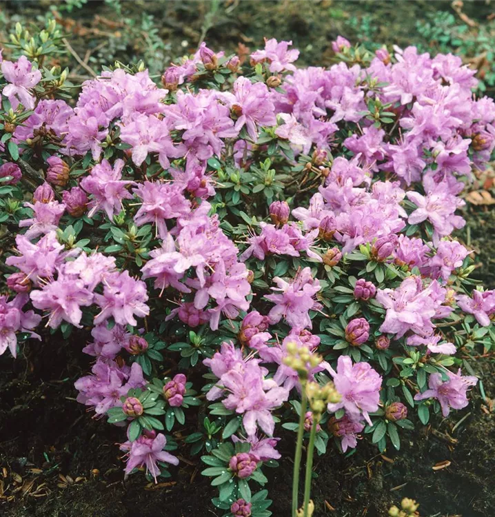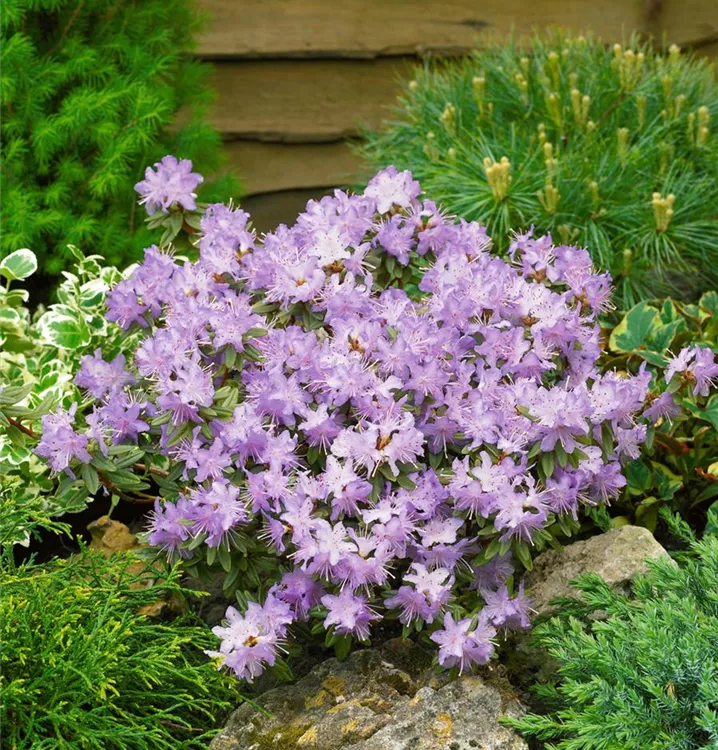 Der Kleinblättrige Rhododendron (Rhododendron impeditum) bringt von Ende April bis Mitte Mai ein wahres Blütenmeer in verschiedenen Farben (je nach Sorte) hervor. Dieses aufrecht, buschig, breit, dicht wachsende Gehölz erreicht gewöhnlich eine Höhe von 30 - 40 cm und eine Breite von 0,6 bis 1 m. Ein halbschattiger (bis schattiger) Standort und ein humoser, kalkfreier Boden schaffen optimale Bedingungen für ein gesundes Wachstum. Der Kleinblättrige Rhododendron ist gut frostverträglich.
