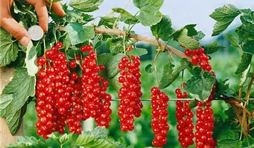 Die Johannisbeere 'Rovada' (Ribes rubrum) bildet hellrote, große Beeren. Diese sind fest und süß-säuerlich im Geschmack. Für eine ertragreiche Ernte ab Juli schaffen durchlässiger, nährstoffreicher Boden und ein sonniger bis halbschattiger Standort optimale Bedingungen. Auch ihre grünen Blüten sind eine schöne Erscheinung.